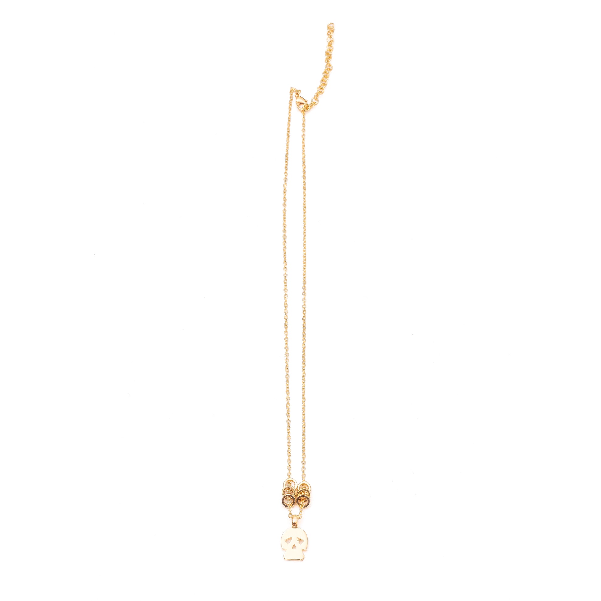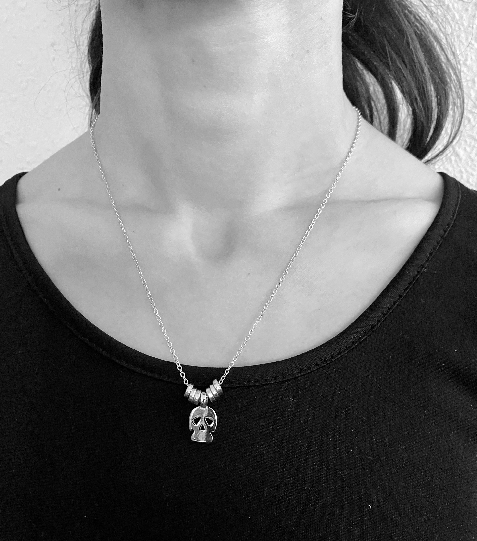 Material: cadena de oro, calavera de latón y 6 aros de latón.