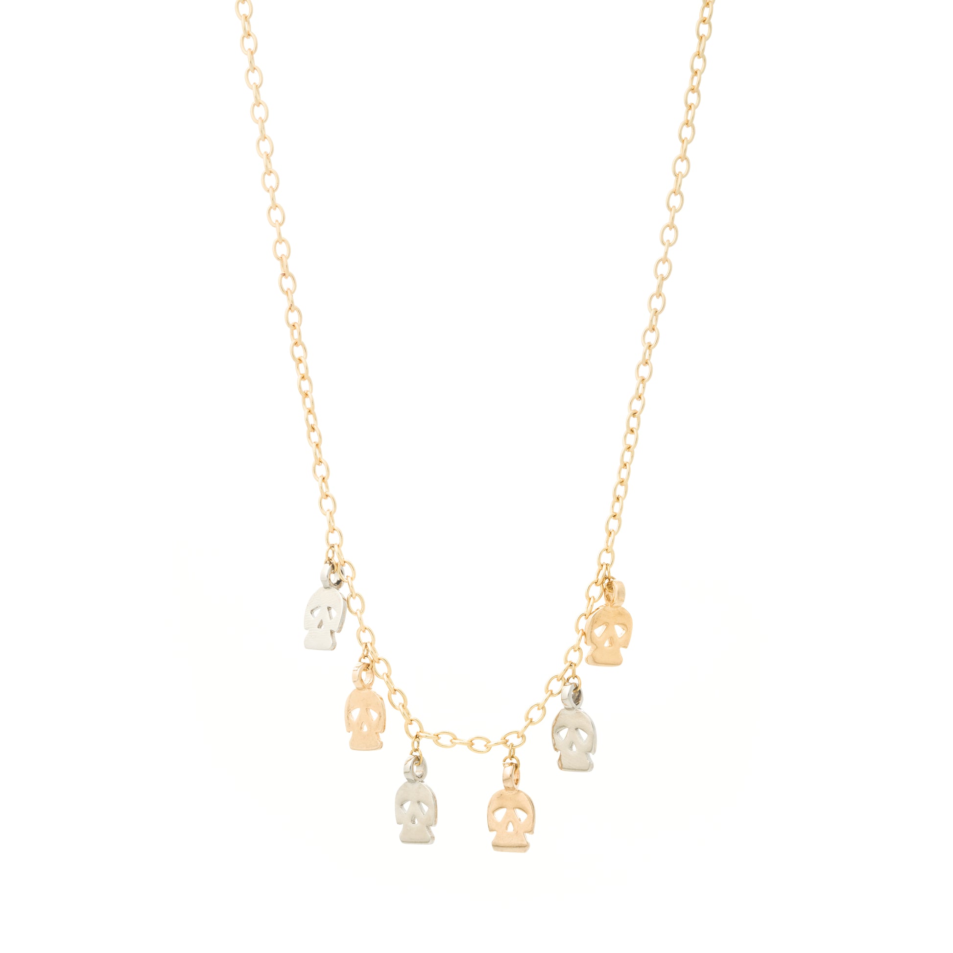 Material: cadena de oro, 3 calaveras de latón y 3 calaveras de latón en chapa de rodio.